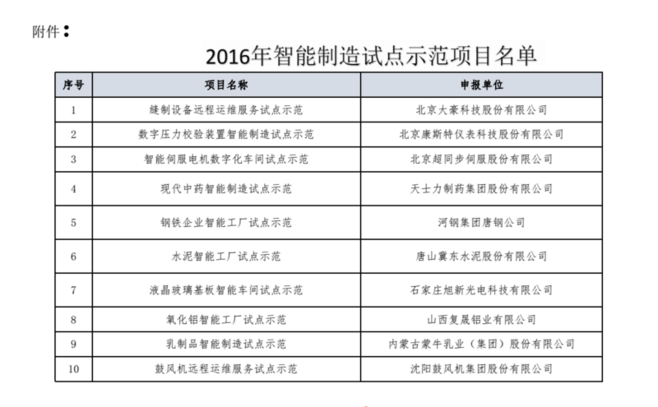 2016年智能制造试点示范项目公示